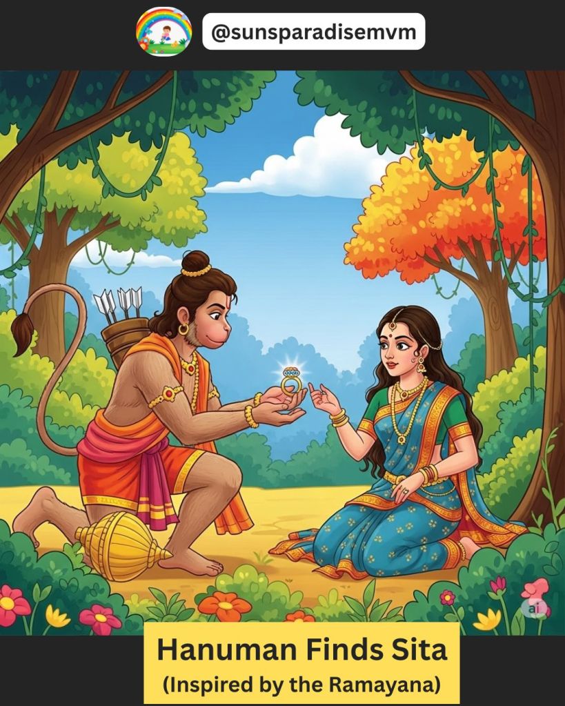 Hanuman slowly came closer. He spoke kindly. “I am Hanuman, Rama’s messenger,” he said. “He sent me to find you.” Then he gave her Rama’s ring.