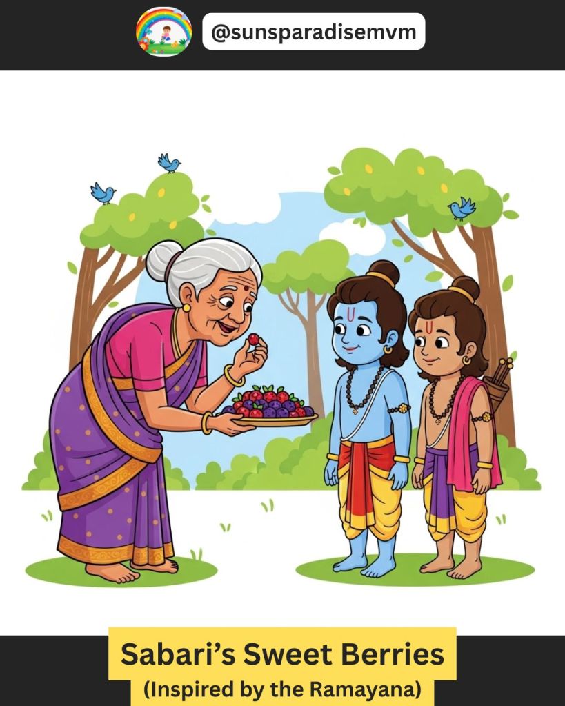 One day, Rama did come. Sabari was filled with joy. She wanted to offer him fruits, but she had nothing fancy — just wild berries.