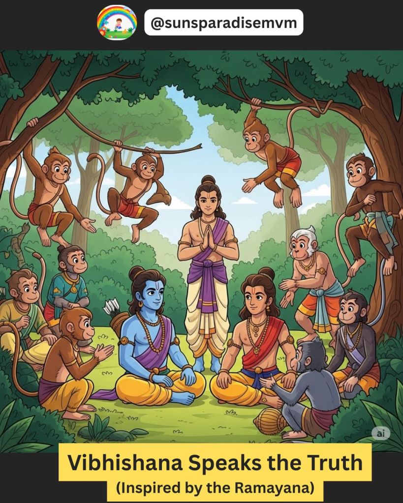 Vibhishana was Ravana’s younger brother. He lived in Lanka, but his heart was kind. When Ravana brought Sita to Lanka, Vibhishana felt very upset.